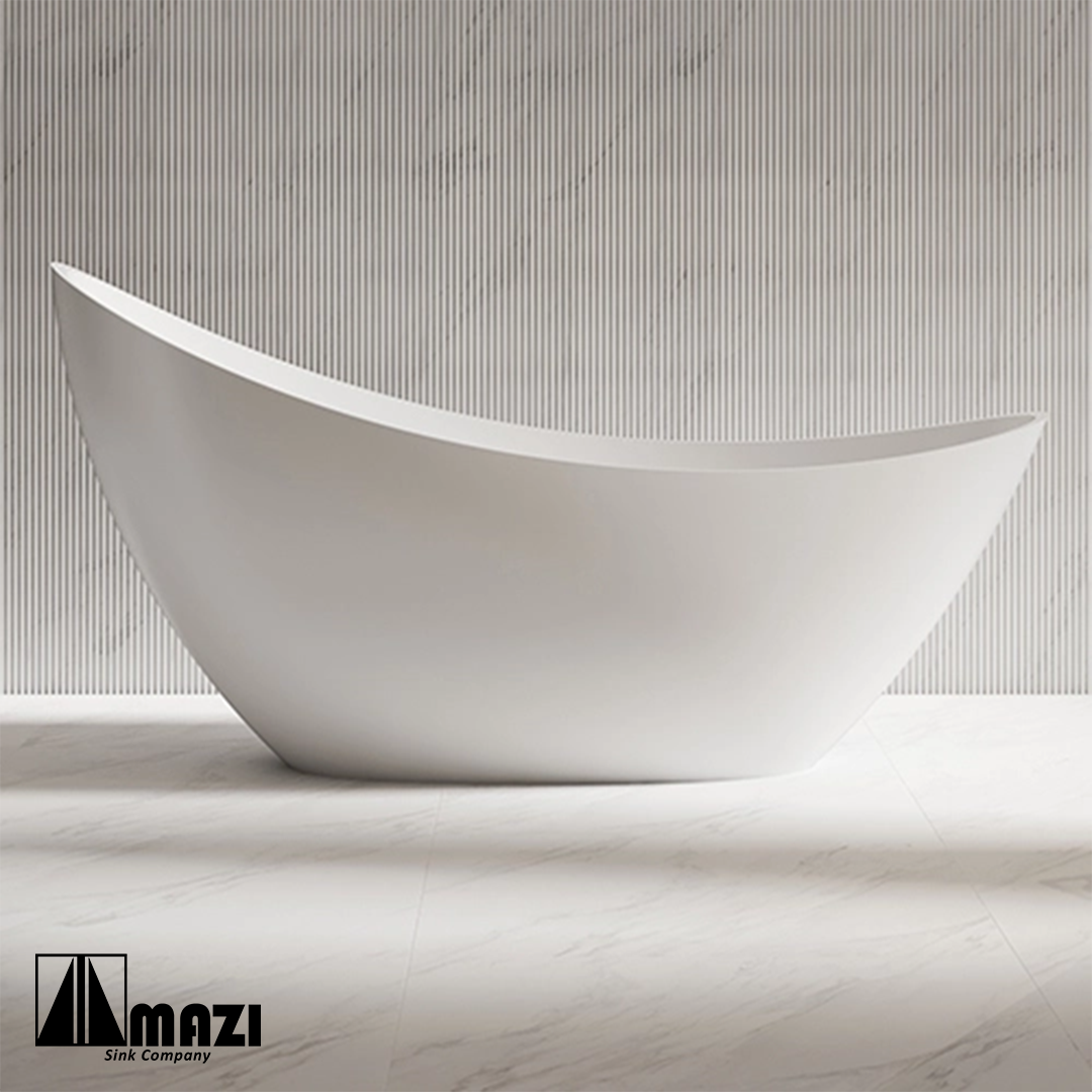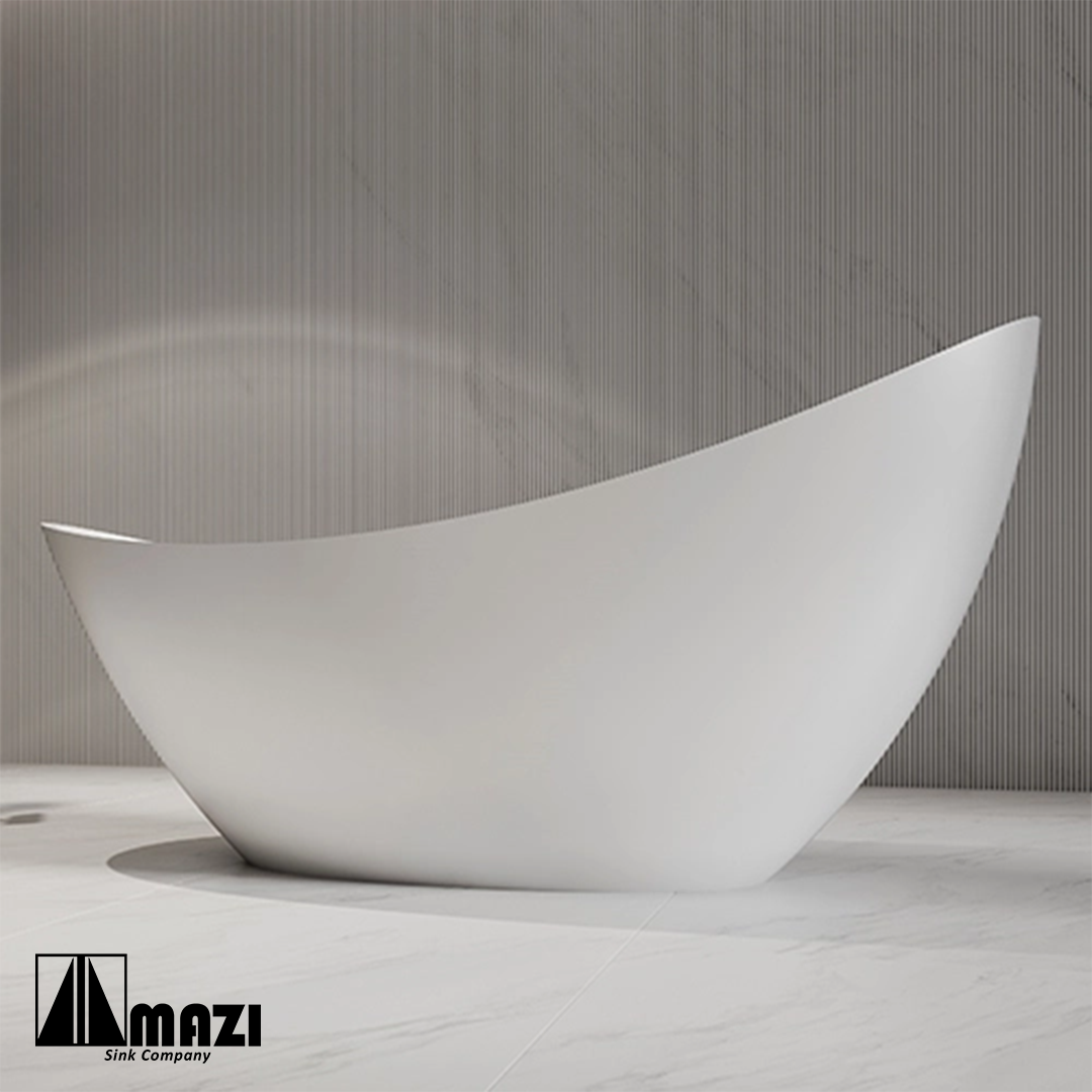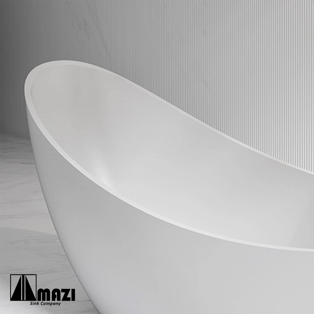 Freestanding Solid Surface Soaking Tub, luxurious and elegant style. Complete fiberglass construction with acrylic topcoat for high durability and shine. Large bathtub for total body immersion.